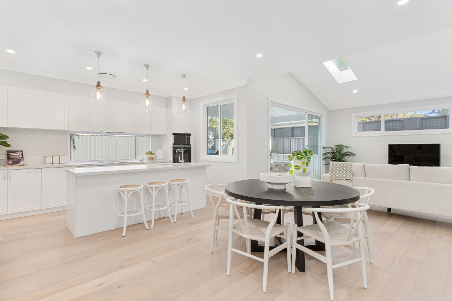 - Tạo điểm nhấn bằng ánh sáng: Ánh sáng led hắt trần, đèn thả bàn ăn hoặc đèn spotlight giúp không gian trở nên sang trọng hơn.